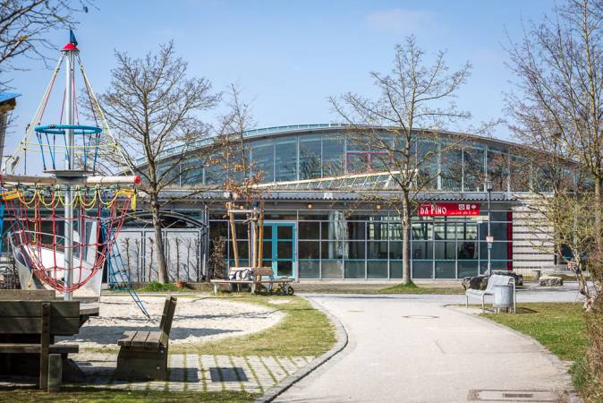 München Ost. Die Anlage liegt in einem ruhigen Gebiet, nähe S-Bahn Station. Helle, großzügige Gruppenräume direkt neben großer Turnhalle und weitläufigem Sportplatzgelände für Fußball, Basketball und ein Spielplatz.